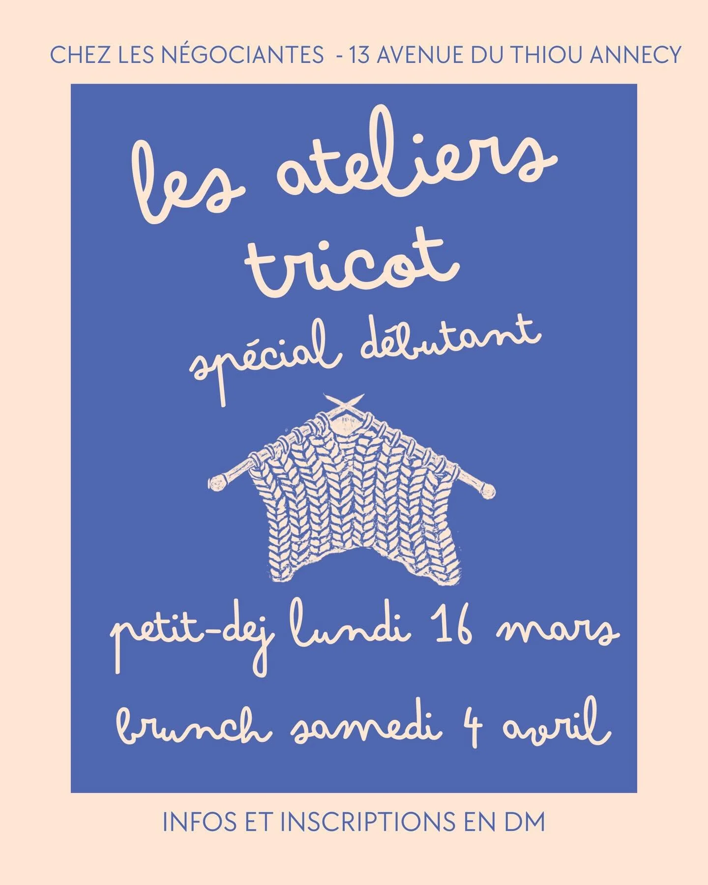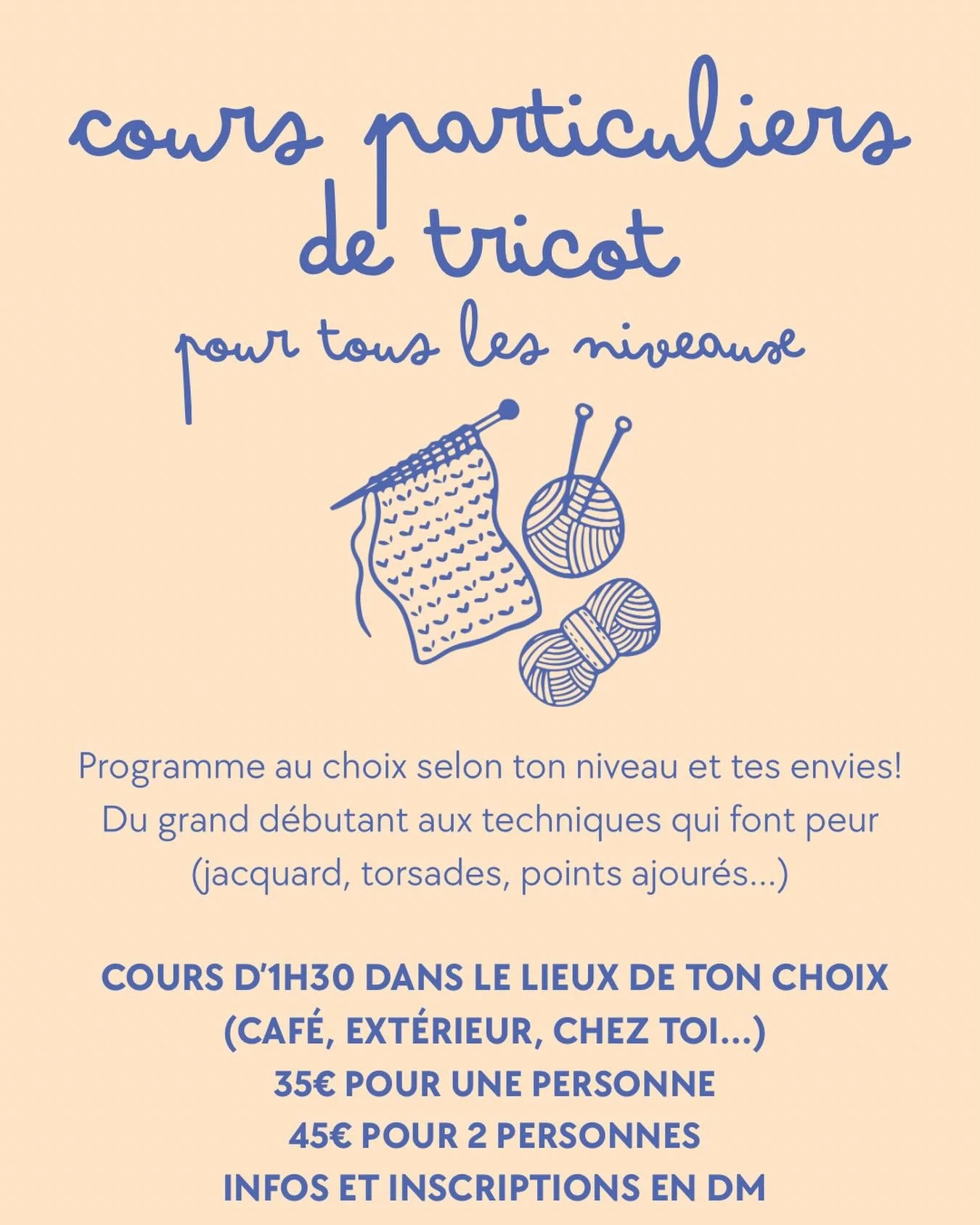 Je propose également des ateliers et cours de tricot pour tous les niveaux, tu peux me contacter si tu as des questions ou pour programmer un cours privé.